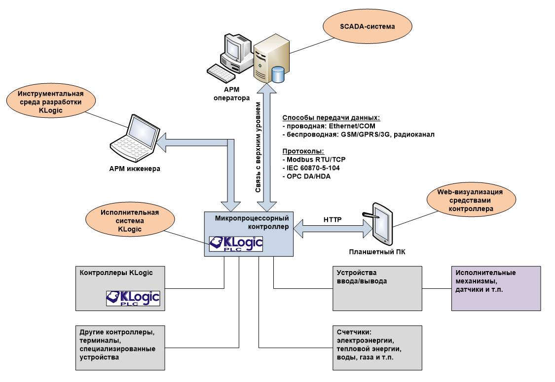 Для связи с контроллером, работающим под управлением исполнительной системы, используются встроенные средства SCADA-системы, которые позволяют организовывать обмен по каналам RS-485 и Ethernet, а также по каналам сотовой связи GSM/GPRS/3G.